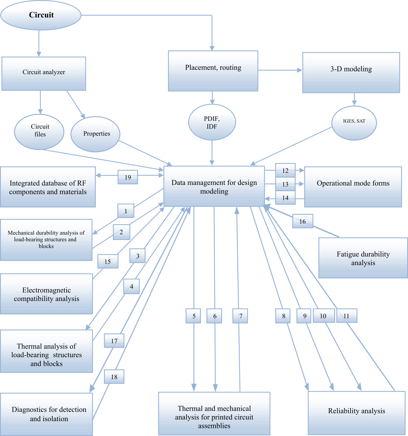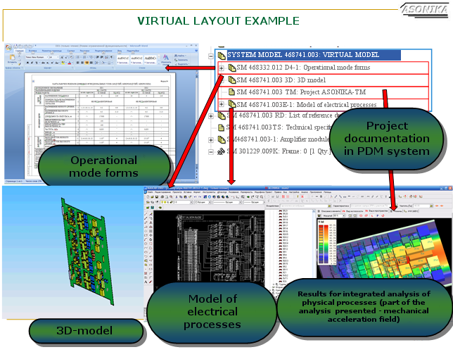 Provide commercial off-the-shelf (COTS) software CAD tool integration such as P-CAD, ASONIKA, Pro/ENGINEER, SolidWorks, Inventor, AutoCAD, PSpice, etc., while managing the transfer of data between various tools when modeling radio-electronic means (REMs) during the design process. Integration can be provided with any existing product data management (PDM) system. During the design, such methodology can help form an integrated electronic REM model based on the mathematical model framework of thermal, electrical, aerodynamic, electromagnetic, and mechanical processes as well as REM reliability and quality mathematical models.